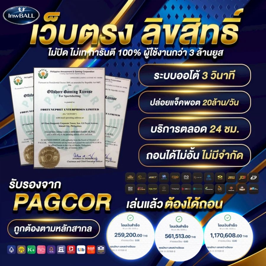 ตอบ : Inwball มีระบบความปลอดภัยสูง รองรับการทำธุรกรรมที่รวดเร็ว และมีโปรโมชั่นที่น่าสนใจสำหรับทั้งผู้เล่นใหม่และสมาชิกประจำ